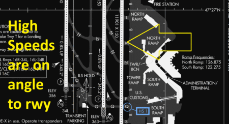All though angled light gray taxiways are designed to a) get aircraft off the active runway and b) get them into the terminal gate areas quickly. After a lot of small single-engine time you learn to “land long” because if you do set it down in 500-600 at the far end of the runway, you’ll taxi all day. Which is entertaining in a new city but NOT on a hot day with the sun beating on you and holding the doors open for cooling…