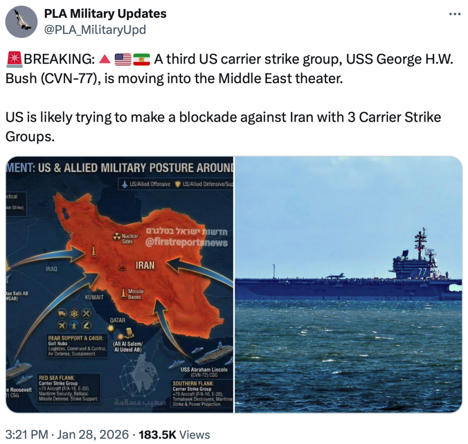 In addition to having the USS Abraham Lincoln positioned south of Iran, the USS Theodore Roosevelt is currently in the Red Sea, and the USS George H.W. Bush is now traveling toward the Middle East…