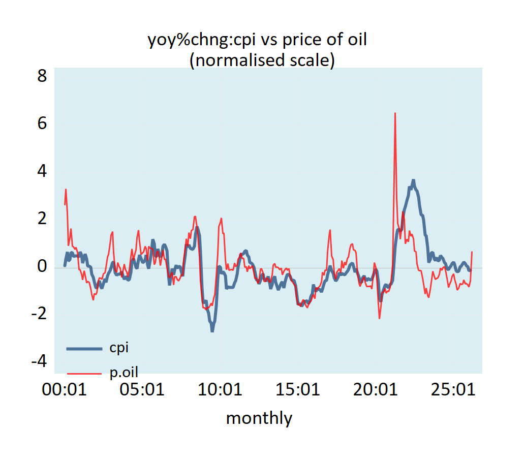 A very good visual correlation between the yearly percentage change in the consumer price index (CPI) and the yearly percentage change in the price of oil seems to provide support to the common idea that future changes in price inflation in the US are likely to be set by the yearly growth rate in the price of oil (see chart).