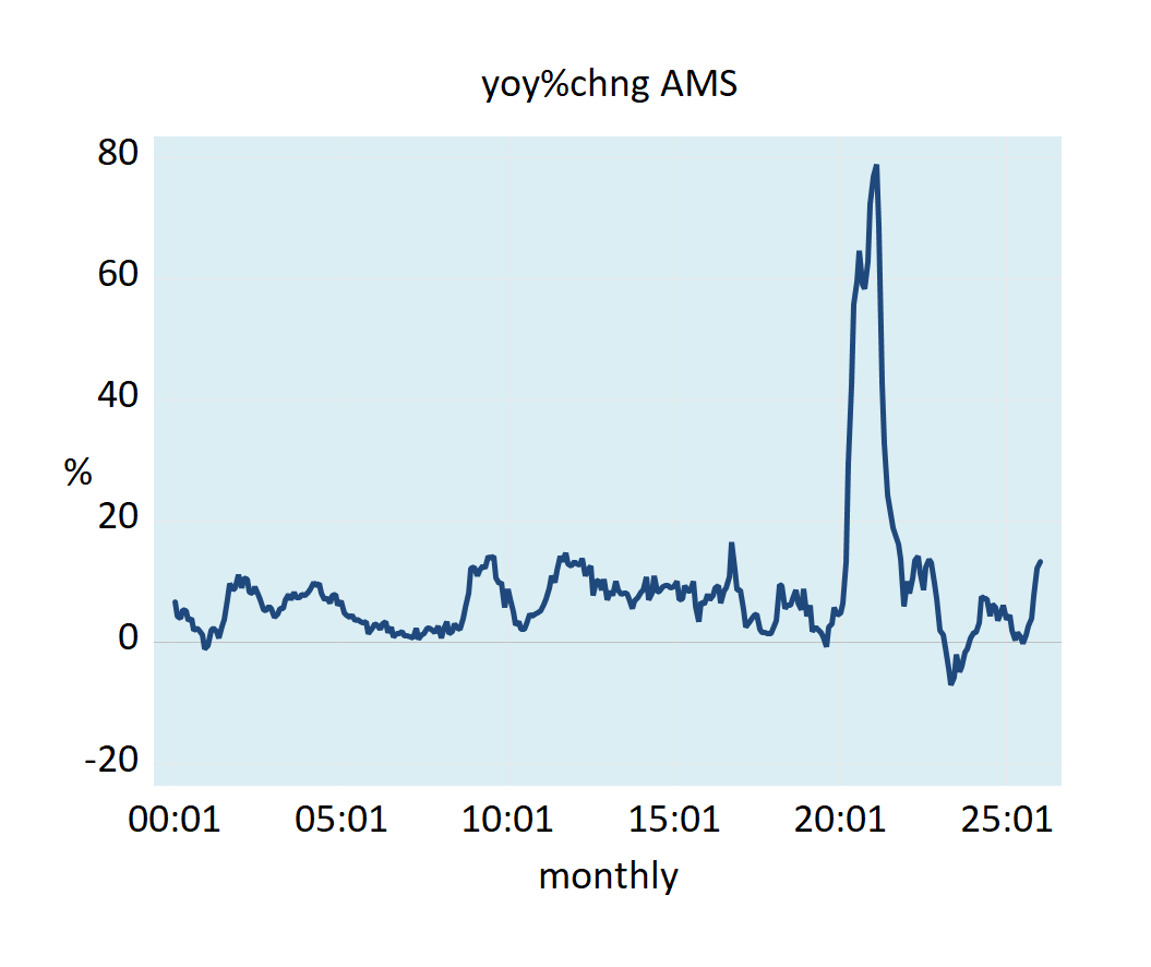 After rising to 79 percent in February 2021, the yearly growth rate of the US money supply AMS followed a visible downtrend until mid-2023, before strengthening until mid-2024, before a renewed softening emerged. Given the long time lag from changes in money supply and its effect on the momentum of the CPI, the yearly growth rate in the CPI is likely to be strongly influenced by the lagged momentum of the AMS in the months ahead, which suggests it may remain elevated in the short term before a softening emerges towards the end of the year. Note that changes in money supply do not affect prices instantly. When money is injected, it moves from one market to another market.