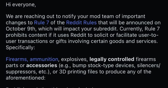 In a major policy shift affecting large segments of the firearm enthusiast community, Reddit has announced an update to Rule 7 of its sitewide content policy that will ban all user-to-user transactions involving firearm parts or enhancements, effective October 9, 2025.