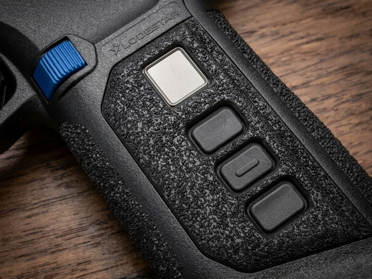The polymer composite frame features a rigid, well-textured surface that provides excellent purchase without being overly abrasive. Critically, the Lodestar LNK9 is “ambidextrous by design.” Rather than an after-thought, Lodestar offers dedicated right-sided and left-sided models. This ensures the Biometric LandingPad™—embedded directly into the grip side panel—and the physical three-button PIN pad are positioned exactly where the shooter’s thumb and fingers naturally rest.