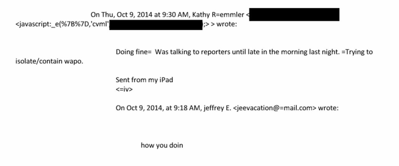 On October 9, 2014, Epstein emailed Ruemmler: “Doing fine. Was talking to reporters until late in the morning last night. Trying to isolate/contain wapo.”
