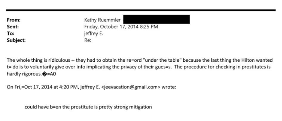 On October 17, 2014, Ruemmler forwarded Epstein a draft of her response to the Post reporter and asked for his input. In the draft, she downplayed the allegations, writing: