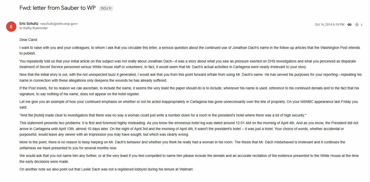Finally, here is the letter that then-Obama White House Deputy Press Secretary Eric Schultz sent in coordination with Ruemmler, to Carol Leonnig who wrote the WaPo article exposing Jonathan Dach’s prostitution scandal, where they beg her to “from this point forward refrain from using Mr. Dach’s name,” as “He has served his purposes for your reporting—repeating his name in connection with these allegations only deepens the wounds he has already suffered.”