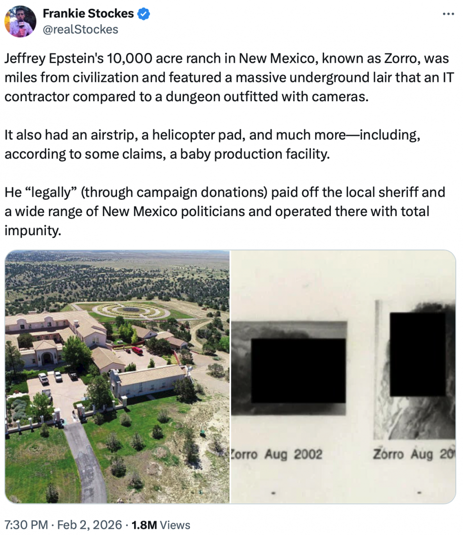 While Little Saint James Island, infamously known as Pedophile, Rape, and Epstein Island, has received the bulk of attention in the fallout from the cover-up of Epstein’s crimes, his Zorro Ranch property is another centerpiece of the crimes committed by his criminal network. Located in the high desert north of the Estancia Basin of central New Mexico, where Epstein was not required to register as a sex offender following his 2008 plea deal in Florida, the sprawling 7,600-acre ranch hosted numerous parties implicated in Epstein’s crimes. Epstein reportedly organized the ranch as the headquarters for his eugenic plot to “seed the human race with his DNA” by impregnating countless women and underaged victims on the property. Victim Annie Farmer, alleges that Epstein and his prime accomplice, Ghislaine Maxwell, sexually abused her at the ranch when she was just 16-years-old.