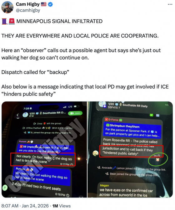 Let’s begin with citizen journalist Cam Higby’s bombshell reporting, who says he “infiltrated organizational signal groups all around Minneapolis with the sole intention of tracking down federal agents and impeding/assaulting/and obstructing them.”