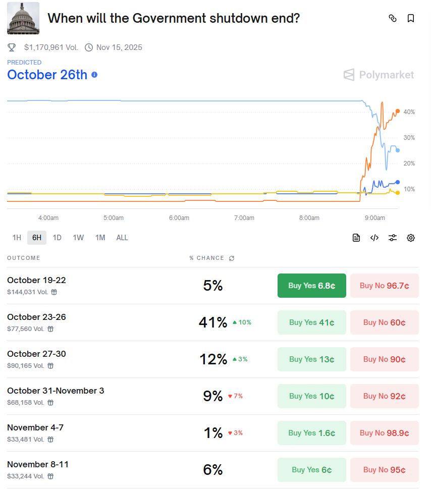 Hassett’s comments added to the market’s Monday morning momentum, and sent Polymarket betters into a frenzy as to when the shutdown will end.